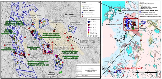 - Grab sample from spodumene bearing pegmatite assayed of 5.60% Li2O at Tarikko Prospect