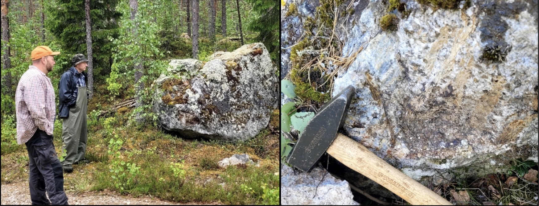 Mōrkylā discovery boulder (left); course spodumene crystals in same boulder assayed 2.46% Li2O (right)