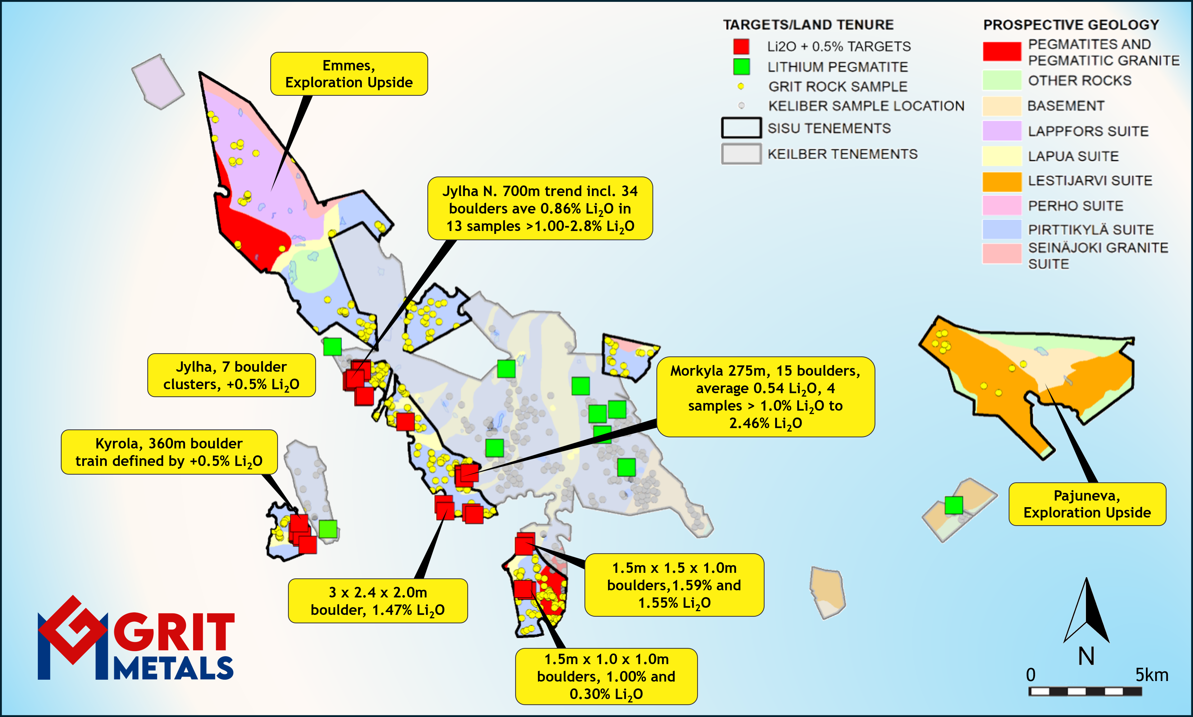 Disclaimer: Grit Metals Corp. cautions investors that grab samples are selective by nature and are not necessarily indicative of average mineralization on the property. Furthermore, mineralization on adjacent properties (e.g., Keliber Oy) does not guarantee similar mineralization on the Company's mineral reservations.