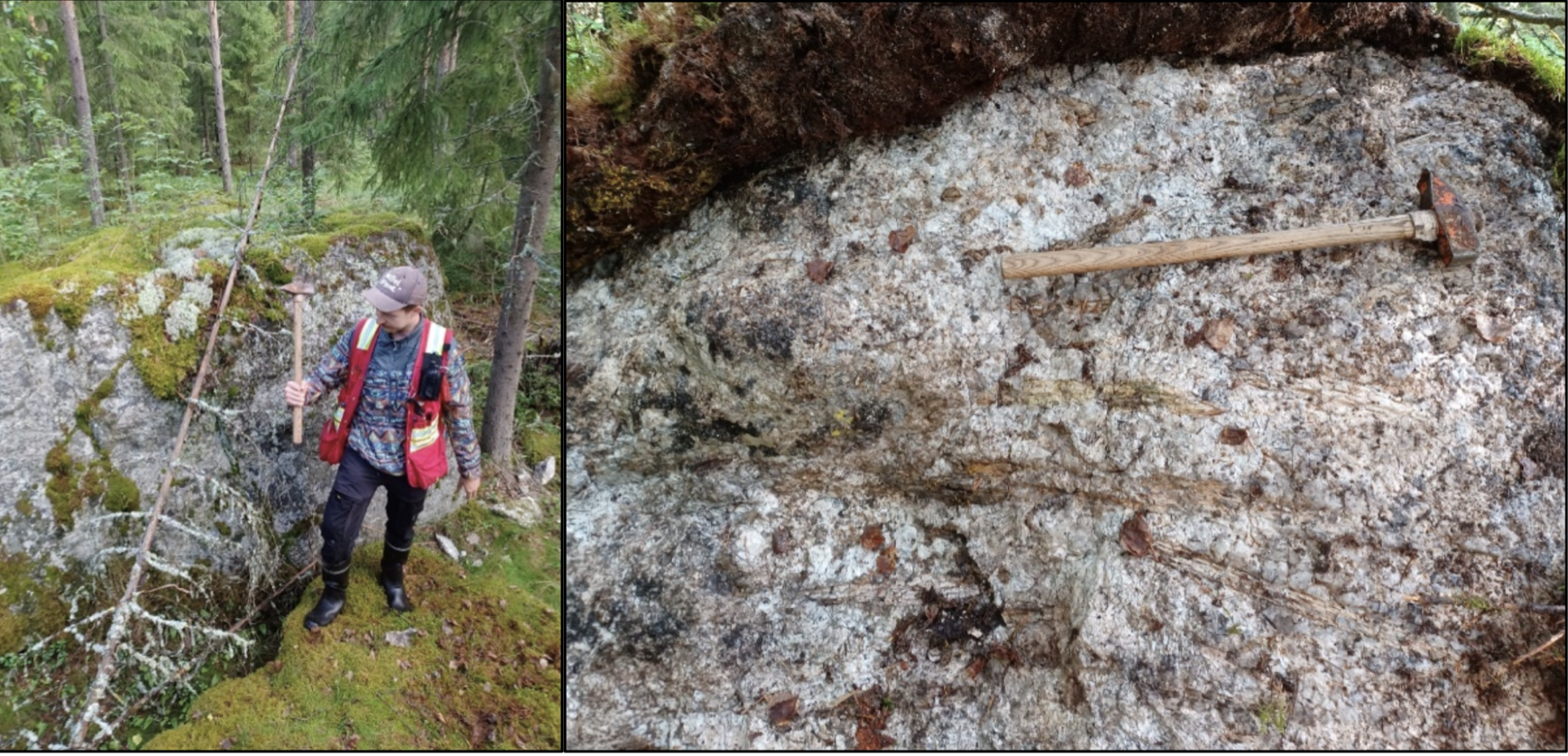 • Mineralogy: The boulders consist of albite-spodumene-quartz-muscovite pegmatite, mineralogically consistent with the commercial deposits in the region. Based on glacial dispersion models (e.g. Ahtola et al, 2015), the bedrock source is interpreted to be located just 300–500 meters northwest of the boulder field.